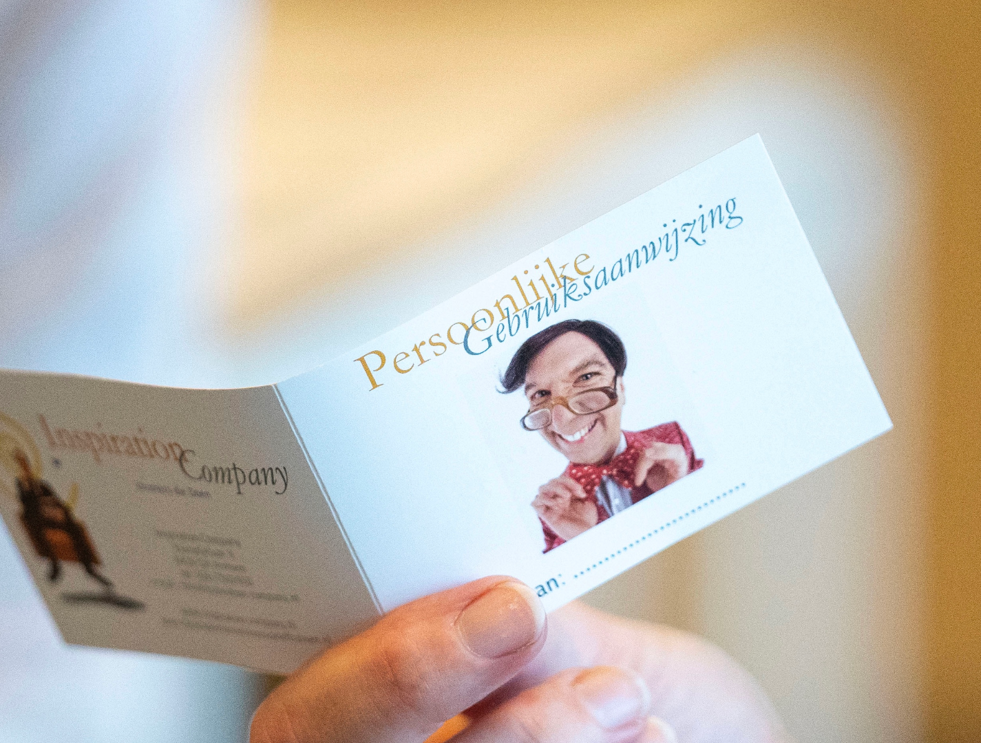 In de 'Workshop Persoonlijke Gebruiksaanwijzing' gaan we kijken hoe we zelf in elkaar steken. Door inspiratie op te doen door middel van kaarten kies je de thema’s die voor jou belangrijk zijn. Waar ga je helemaal van aan? Waardoor stroomt jou energie maximaal? Waar wordt je helemaal blij van? Wat moet een ander bij jou doen om op die aan knop te drukken? En ook de andere kant wordt bekeken, waar ga je nou helemaal van uit? Wat moet je bij jou nou absoluut niet doen? Wat is jouw uit knop?